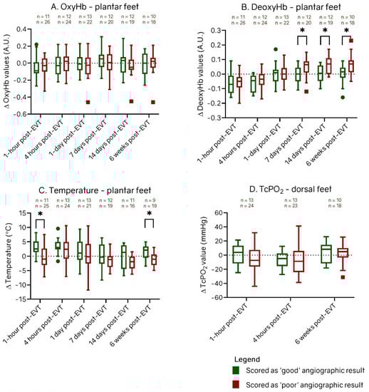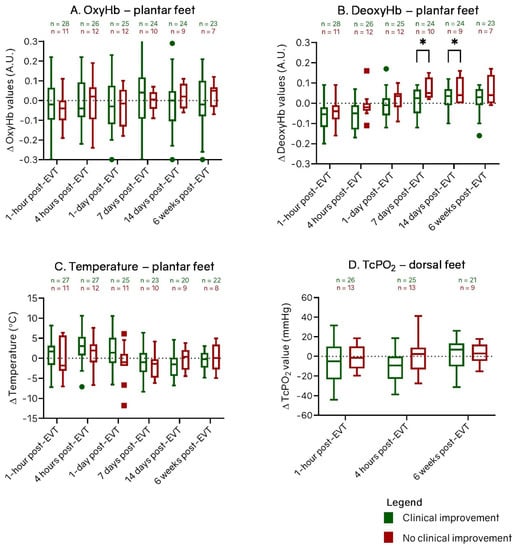 Box-and-whisker plots of change between patients with and without clinical improvement in (A) oxyhemoglobin (OxyHb), (B) deoxyhemoglobin (DeoxyHb), and (C) temperature values at the plantar side and (D) change in transcutaneous oxygen pressure (TcPo2) values at the dorsal side of all treated feet after endovascular therapy (EVT). Groups are divided in limbs with (green) and without (red) clinical improvement at 6 weeks. The horizontal line in the middle of each box indicates the median; the top and bottom borders of the box mark the 75th and 25th percentiles, respectively, and the whiskers mark the highest value and lowest value within 1.5 × IQR of the 75th and 25th percentiles. The dots are outliers of patients with clinical improvement and the squares are outliers of patients without clinical improvement. A.U.: arbitrary units. * p < 0.05.