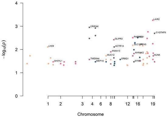 After filtering the GWAS data with sequence ontology, MAF, and HWE, the 20 SNPs most significantly associated with RC tears were identified in the order of lowest to highest p values (Table 2). The Manhattan plot of the filtered data is shown in Figure 2, along with the genetic positions on each chromosome. SNP rs2287828 (LAIR2) was most significantly associated with RC tears, with an odds ratio over nine folds (p = 5.49 × 10−4). SNP rs9328733 (CRIPAK) and rs2228991 (REST) were second and third, respectively, and were significantly associated with RC tears (p = 1.11 × 10−3, p = 1.20 × 10−3, respectively).