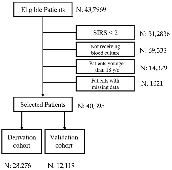 We conducted a cohort study consisting of retrospectively captured target patients in the ED of National Cheng Kung University Hospital (a university-affiliated medical center with 1400 beds) from January 2015 to December 2019. The inclusion criteria were ED adults (≥18 years) presenting with systemic inflammatory response syndrome (SIRS) who had blood cultures during their ED stay. Exclusion criteria included patients with incomplete information detailing our measurements and outcomes. The layer sampling method was used to divide all the targeted patients into a 70% derivation dataset and a 30% validation dataset.
