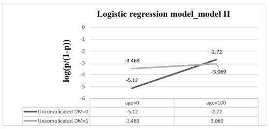 The interaction of age and uncomplicated DM when other explanatory variables are based onreference groups. The equation of the logistic regression model is log(p/(1 − p)) = −5.12 + 0.024 × age + 1.615 × uncomplicated DM − 0.02 × age × uncomplicated DM. (DM = diabetes mellitus).