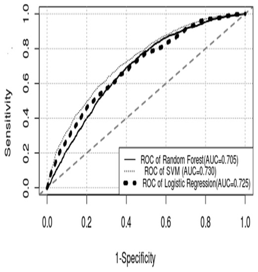 We used the ROC curve and the tangent of slope 1 to solve the sensitivity, specificity, and confusion matrix. The sensitivity, specificity, and positive likelihood ratio each of the models were 0.660, 0.653, and 1.902 for LR; 0.698, 0.631, and 1.892 for SVM; and 0.661, 0.639, and 1.831 for RF. The LR model with the best performance (model II) was tested with SVM and RF models. However, as shown in Table 4, irrespective of the SVM or RF model, there was no statistical evidence to support that the performance of the model created with LR was superior to that of the models created with SVM and RF.