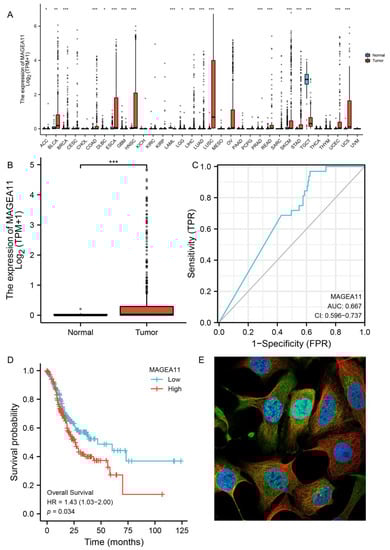 MAGEA11 expression and prognosis. (A) Expression of MAGEA11 in pan-cancer. (B) MAGEA11 mRNA expression in gastric cancer and normal tissues. (C) ROC curve. (D) Kaplan–Meier survival curve. (E) The subcellular distribution of MAGEA11. Green is the target protein staining, red is microtubules staining, and blue is nucleus staining. (* p < 0.05, ** p < 0.01, and *** p < 0.001).