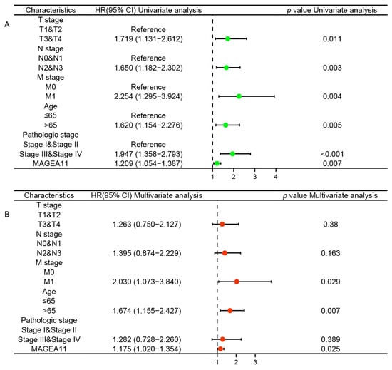Cox regression analysis of MAGEA11 expression and related clinical features in overall survival of STAD patients. (A) Univariate Cox regression analysis. (B) Multivariate Cox regression analysis.