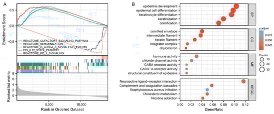 According to the median expression value of MAGEA11, we examined differentially expressed genes (DEGs) between low and high MAGEA11 expression groups to understand the biological function. A GSEA pathway analysis was performed (Figure 3A). The results show that high expression is enriched in REACTOME_OLFACTORY_SIGNALING_PATHWAY, REACTOME_KERATINIZATION and REACTOME_G_ALPHA_S_SIGNALLING_EVENTS. Low expression was found to be enriched in PID_IL12_STAT4_PATHWAY, REACTOME_PD_1_SIGNALING. Meanwhile, we completed GO and KEGG analysis (Figure 3B). The first five BP terms were associated with cornification, keratinocyte differentiation, keratinization, epidermal cell differentiation, and epidermis development. The first five CC terms are related to cornified envelope, keratin filament, intermediate filament, chylomicron, and integrator complex. The first five MF terms are related to hormone activity, structural constituent of epidermis, GABA-A receptor activity, chloride channel activity, and GABA receptor activity. KEGG is mainly enriched in cholesterol metabolism, complement and coagulation cascades, nicotine addiction, neuroactive ligand–receptor interaction, and Staphylococcus aureus infection.