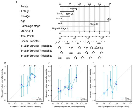 A nomogram was constructed to predict the survival probability of STAD patients. (A) Nomogram for predicting 1-, 3-, and 5-year STAD survival probability, including MAGEA11 and clinical risk factors. (B–D) Calibration curves of the nomogram predicting OS in patients with STAD. Calibration curves of the nomogram predict 1-year (B), 3-year (C), and 5-year (D) OS in patients with STAD.