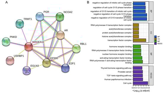 The PPI network was constructed from the STRING database, and GO and KEGG analyses were performed. Figure 5A shows a network of MAGEA11 and its 10 interacting genes. As shown in Figure 5B, the interacting genes in BP are related to negative regulation of G1/S transition of mitotic cell cycle, negative regulation of cell cycle G1/S phase transition, regulation of G1/S transition of mitotic cell cycle, regulation of cell cycle G1/S phase transition, and negative regulation of mitotic cell cycle phase transition. In CC, interacting genes are mainly enriched in transcription factor complex, histone acetyltransferase complex, protein acetyltransferase complex, acetyltransferase complex, RNA polymerase II transcription factor complex, and other functions. MF annotation shows that these genes are involved in RNA polymerase II activating transcription factor binding, activating transcription factor binding, nuclear hormone receptor binding, RNA polymerase II transcription factor binding, hormone receptor binding, and other functions. In KEGG enrichment analysis, interacting genes were found in cell cycle, human papillomavirus infection, TGF-beta signaling pathway, prostate cancer, and thyroid hormone signaling pathway.