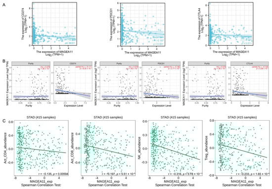 Correlation of MAGEA11 with immune checkpoints and immune cell infiltration. Correlation between MAGEA11 and PD-L1 (CD247), PD-1(PDCD-1), CTLA-4 expression in (A) the TCGA-STAD database and (B) TIMER database, respectively. (C) MAGEA11 and Act_CD4 + T cells, Act_CD8 + T cells, NK cells, and Treg cells’ correlation abundance.