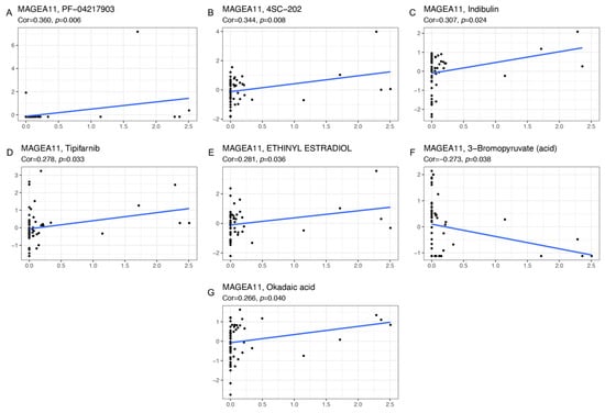 Genes associated with the sensitivity and resistance of cancer drugs have been extensively studied [,]. We explored the sensitivity of MAGEA11 gene to common antitumor drugs using the CellMiner database, and further calculated the relationship between gene expression and drug sensitivity. The study found that the expression of MAGEA11 gene was related to 7 kinds of drug sensitivity (Figure 7). Among them, MAGEA11 was negatively correlated with 3−Bromopyruvate (acid) and positively correlated with PF-04217903, 4SC-202, Indibulin, Tipifarnib, ETHINYL ESTRADIOL, and Okadaic acid.