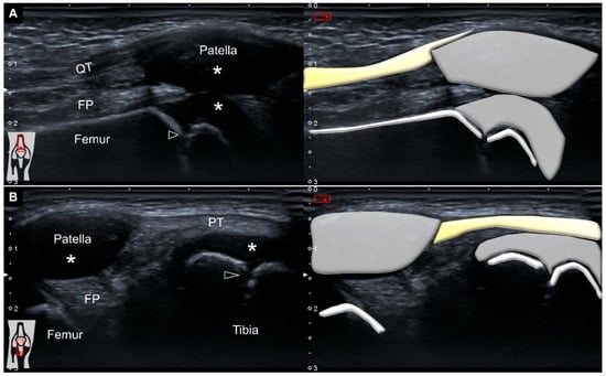 Ultrasound imaging and schematic drawing of the (A) suprapatellar and (B) infrapatellar regions. QT: quadriceps tendon; FP: fat pad; PT: patellar tendon; *: hyaline cartilage; black arrowheads: growth plate.