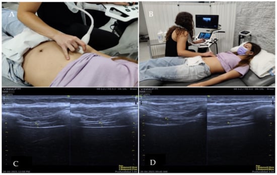 Ultrasound imaging and ultrasonography of the RA. (A) represents the RA muscle thickness at rest. (B) corresponds to the transducer position above the navel and right by the linea alba.