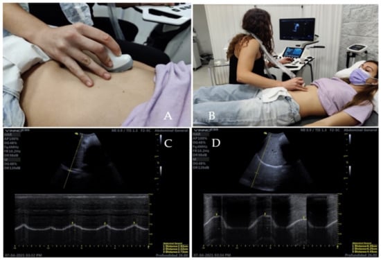 Ultrasound image of diaphragmatic excursion measurement in TV (A) and FV (B). (A) demonstrates transducer placement for an anterior subcostal projection placed between the anterior axillary and mid-clavicular lines. (B) represent the subject and examiner position. (C) corresponds to the diaphragmatic excursion when breathing in TV. (D) corresponds to the diaphragmatic excursion when breathing in FV.