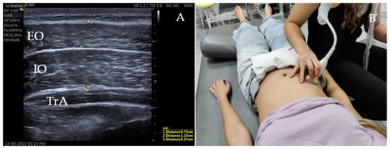 Ultrasound image and ultrasonography of the lateral musculature of the abdominal wall. (A) corresponds with the thickness of the lateral abdominal muscles at rest. (B) demonstrates the lineal transducer position between the costal cartilage of the eleventh rib and the iliac crest.