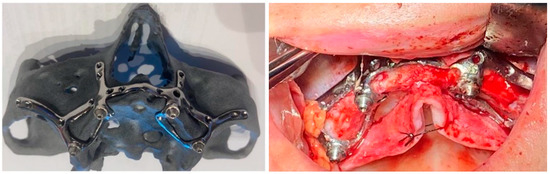 Each of the custom-made implants was designed with partial endosseous support to connect plates and suitable osseointegration. Implants were designed with a 0.7 mm thickness to adapt to both the jaw’s buttresses through fixation with 2 mm × 6 mm sandblasted large grits and acid-etched (SLA) treated osteosynthesis screws. Bone grafting was planned to be performed simultaneously with the placement of the implant.