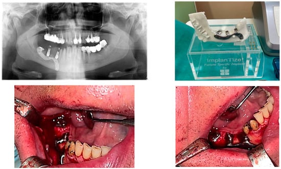 In the past, there was a possibility of placing a subperiosteal implant in cases of severe bone resorption, but the manufacturing technique was rudimentary for this type of implant and was abandoned in favor of endosseous implants. A subperiosteal implant is a type of implant that is placed under the periosteum, directly on the maxillary or mandibular bone [13,14]. It usually has four transmucosal parts which pass through the mucosa and into the oral cavity, connecting the implant to the fixed prosthesis [14,15].
