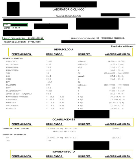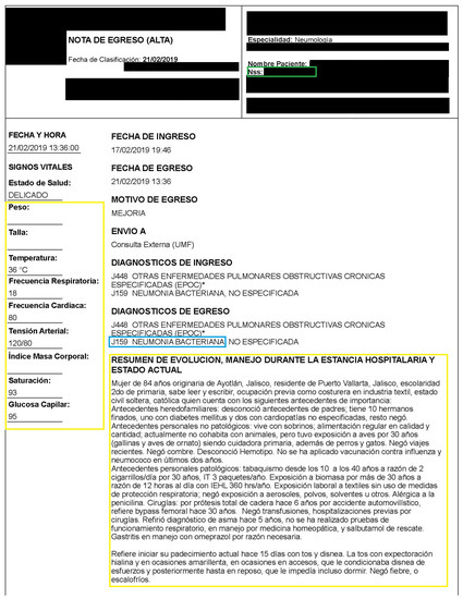 Table 3 shows the structure of the discharge summaries and Figure 2 shows a sample of a discharge summary where confidential information is censored and the identity attribute used in the database is indicated in a green box. The yellow boxes highlight the structured and unstructured information used in the study; in a blue box is the diagnosis code according to ICD-10.