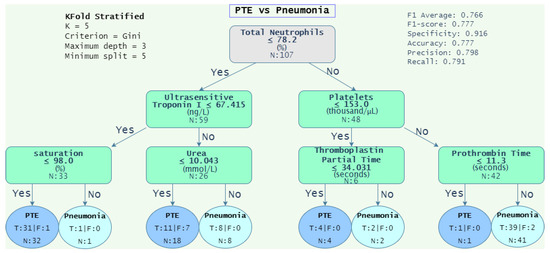 The diagnosis of pneumonia and PTE present particular complexity considering the similarity of their symptoms, this is, cough, shortness of breath, and chest pain [9,10]; also, the given signs and symptoms are often subjective and nonspecific. For this reason, the criteria or auxiliary diagnoses specified in the guidelines [6,11] should always be complemented by the treating physician’s determination. Along with the inherent difficulty of diagnosing such diseases, medical staff must analyze, as quickly as possible, the patients’ health history, which nowadays is stored in electronic health records (EHRs). Examples of such data are laboratory tests, medical auscultation, and clinical history [12]. All this information could be helpful to medical staff to increase certainty in making a diagnosis.
