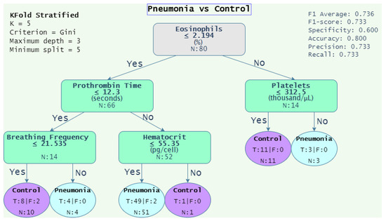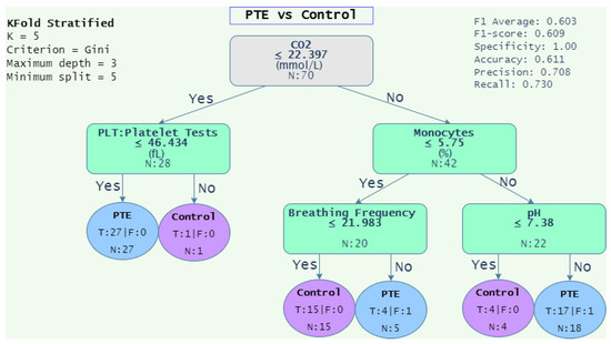 To perform the training and evaluation of the machine-learning algorithms, six binary datasets were created with respect to the target attribute (i.e., final diagnosis): (1) PTE vs. Pneumonia, (2) Control vs. PTE, (3) Control vs. Pneumonia, (4) PTE vs. Rest, (5) Pneumonia vs. Rest, and (6) Control vs. Diseases. Such datasets were built intending to find patterns that differentiate patients: (a) that suffer from PTE or pneumonia from those who do not (Datasets 2 and 3); (b) that suffer pneumonia from those that suffer from PTE (Dataset 1); (c) that suffer from a pulmonary disease from those who do not (Dataset 6); (d) PTE or pneumonia from control or another pulmonary disease (Datasets 4 and 5). Model evaluation was performed using area under curve (AUC-ROC), classification accuracy (CA), and F1-score. The ML models used were decision trees (DT), support vector machine (SVM), random forest (RF), artificial neural networks (ANN), naïve Bayes (NB), and AdaBoost.