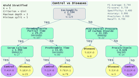 DT consists of a supervised learning method that learns from training tuples labeled by class, resulting in a flowchart-like structure, which is made up of internal nodes that denote a test on an attribute, branches that represent a test result, leaf nodes (or terminal nodes) that have a class label, and, finally, the top node that represents the most significant attribute [14]. The DT models require an attribute split criterion such as the Gini index, which considers a binary division for each attribute and measures the impurity of the data set, a data partition, or a set of training tuples (D), as shown in Equation (2). is the probability that a tuple in D belongs to class (), which is estimated by [14].
