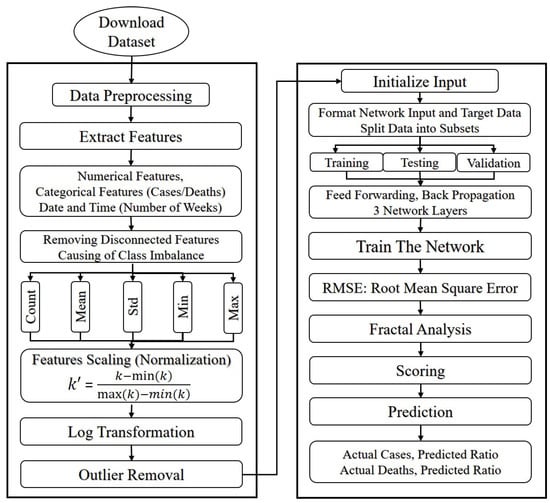 The proposed model for this work is the multi-layer perceptron neural network (MLPNN), whose flowchart/structure is illustrated in Figure 1. For this study, we collected data from the website of the World Health Organization [53]. The data used for this research were statistical data and contained no personally identifiable human photos, audios, videos, or other materials. Additionally, all procedures were conducted in accordance with the necessary rules and laws. As shown in Figure 1, the downloaded dataset was pre-processed using features extraction. We considered the categorical features (infected cases, number of deaths, and number of weeks) for this study. We tuned the model by removing the disconnected features that were causing the class imbalance, for example, we did not consider patients who had other diseases such as heart disease, cancer, diabetes, old age, etc. These features were causing a class imbalance, e.g., it was not necessary for all COVID-19 infected patients to be heart patients and vice versa. After removing the disconnected features, we normalized the data and initialized the input data by splitting it into subsets, i.e., 80% for training and 20% for testing. This splitting is typically made in a layered or randomized way to ensure the data are dispersed in the sample data of the subgroups, which minimizes biases or deviations in the data. The classification model that we utilized in the approach was trained using the training data and test data to evaluate the classifier’s performance over an unobserved subset of the data. We applied a three-layered feed-forward network (multi-layer perceptron neural network) model for training, testing, and validation. The MPLN is discussed briefly in the following sections.