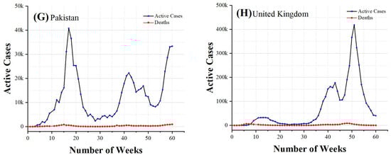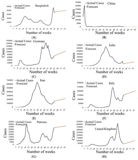 The accurate and robust forecasting of COVID-19 cases and deaths can assist government interventions and encourage the general public to consider effective actions to slow down the spread of this disease [9]. Researchers have conducted multiple studies to explore the COVID-19 associated risk factors and emotional effects, covering various categories such as nature, health, lockdown, etc., using different models [8,10]. Machine learning models, such as random forest, support vector machine (SVM), K- nearest neighbors (KNN), artificial neural networks, and many others, have also been used to predict the COVID-19 situation [11]. The reproduction rate of a disease is of great concern to epidemiologists as this is what determines a pandemic; a reproduction rate greater than one indicates a pandemic in the population [12]. The nature of COVID-19 has been studied by taking a variety of mathematical models into account. The most used model for analyzing disease dynamics is the Susceptible-Infectious-Recovered (SIR) model. This model uses a system of differential equations that are time-dependent to predict epidemic growth. Researchers have extensively employed the SIR model and different modified forms to study Ebola and AIDS [13,14]. Godio et al. [15] studied the recent SARS-CoV-2 pandemic outbreak by taking data from Italy using the SEIR epidemiological model. They used a Particle Swarm Optimization (PSO) solver to create a stochastic method to fit the model parameters, which improved the predictability of the prediction in a medium run of thirty days. Their findings matched Spanish and South Korean statistics and forecasts. Baleanu et al. [16] and some other researchers [17,18] used the Caputo–Fabrizio derivative to create a COVID-19 fractional differential equation model. The data on COVID-19 reflect a sequence of observations and time-series prediction approaches e.g., artificial neural network-based methods and meta-predictors are all native to the statistics [19,20]. For time-series forecasting, ANNs are frequently used [21]. ANN-based techniques have many advantages over machine learning techniques and one of the key advantages is that ANN can be fed raw data and discover the desired features automatically [22]. ANNs give accurate results based on numerous factors such as performance, accuracy, latency, speed, convergence, and size [23,24]. It is important to note that this research relies on artificial neural networks (ANNs) for forecasting the COVID-19 situation in certain countries.