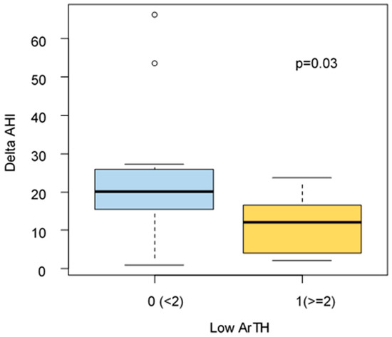 Edward’s score for ArTH was available for 23/32 patients. A significantly higher reduction of Delta AHI, after 6 months of treatment, was found for patients without low ArTH (delta AHI: 20.2 vs. 12.2 p = 0.03) (Figure 2 and Figure 3).