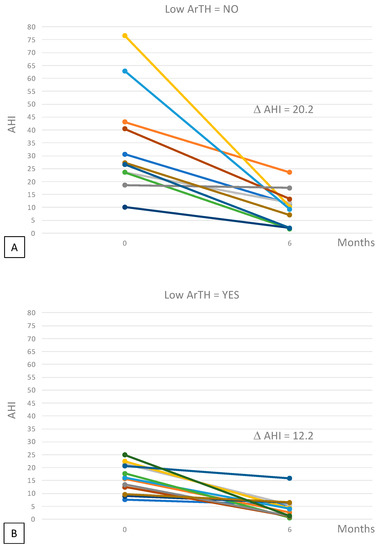 Spaghetti plots reporting the individual data (different color for each patients) of the variation of AHI among patients without low ArTH (panel (A)) and with low ArTH (panel (B)). D AHI was 20.2 vs. 12.2, respectively; p = 0.03.