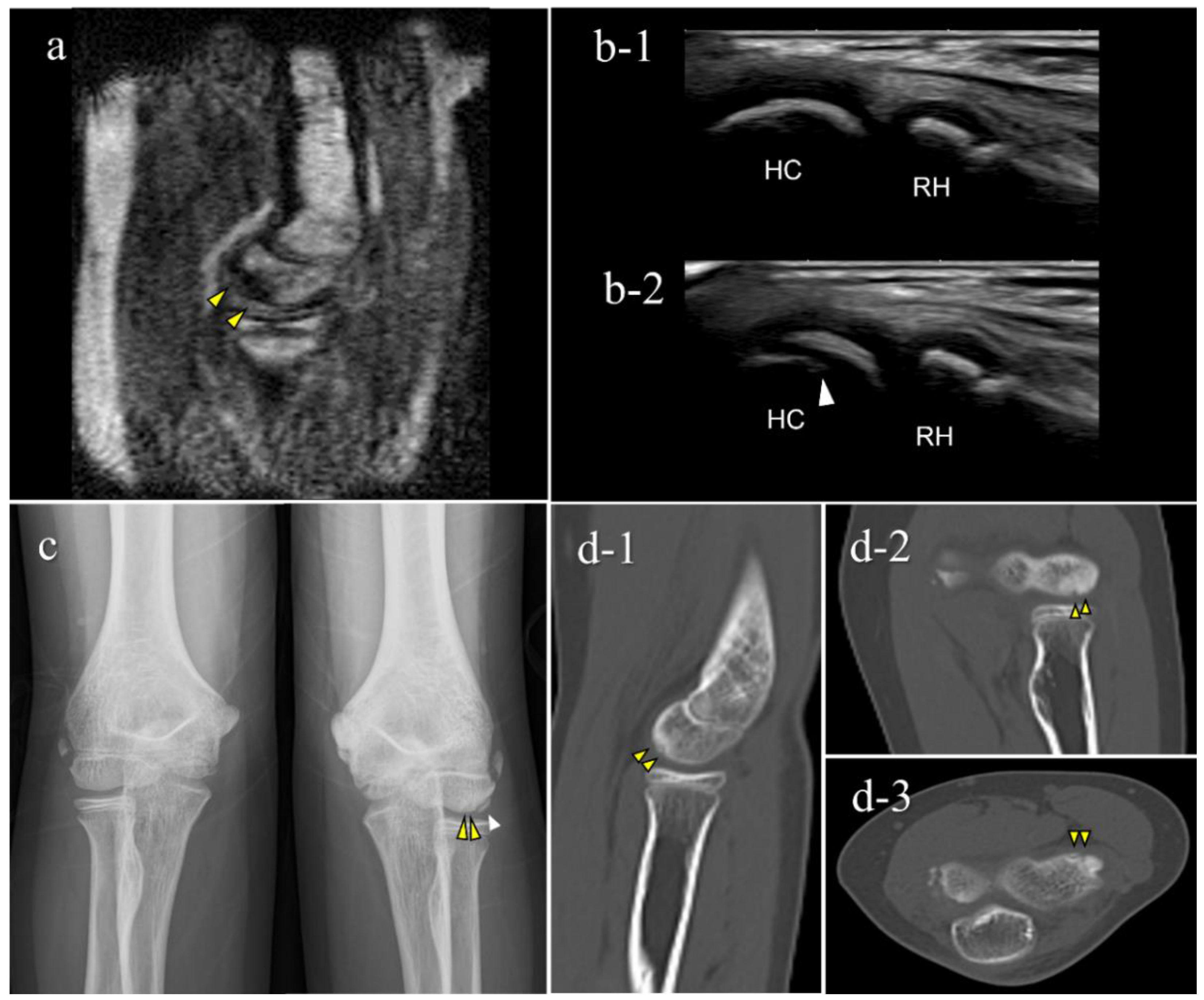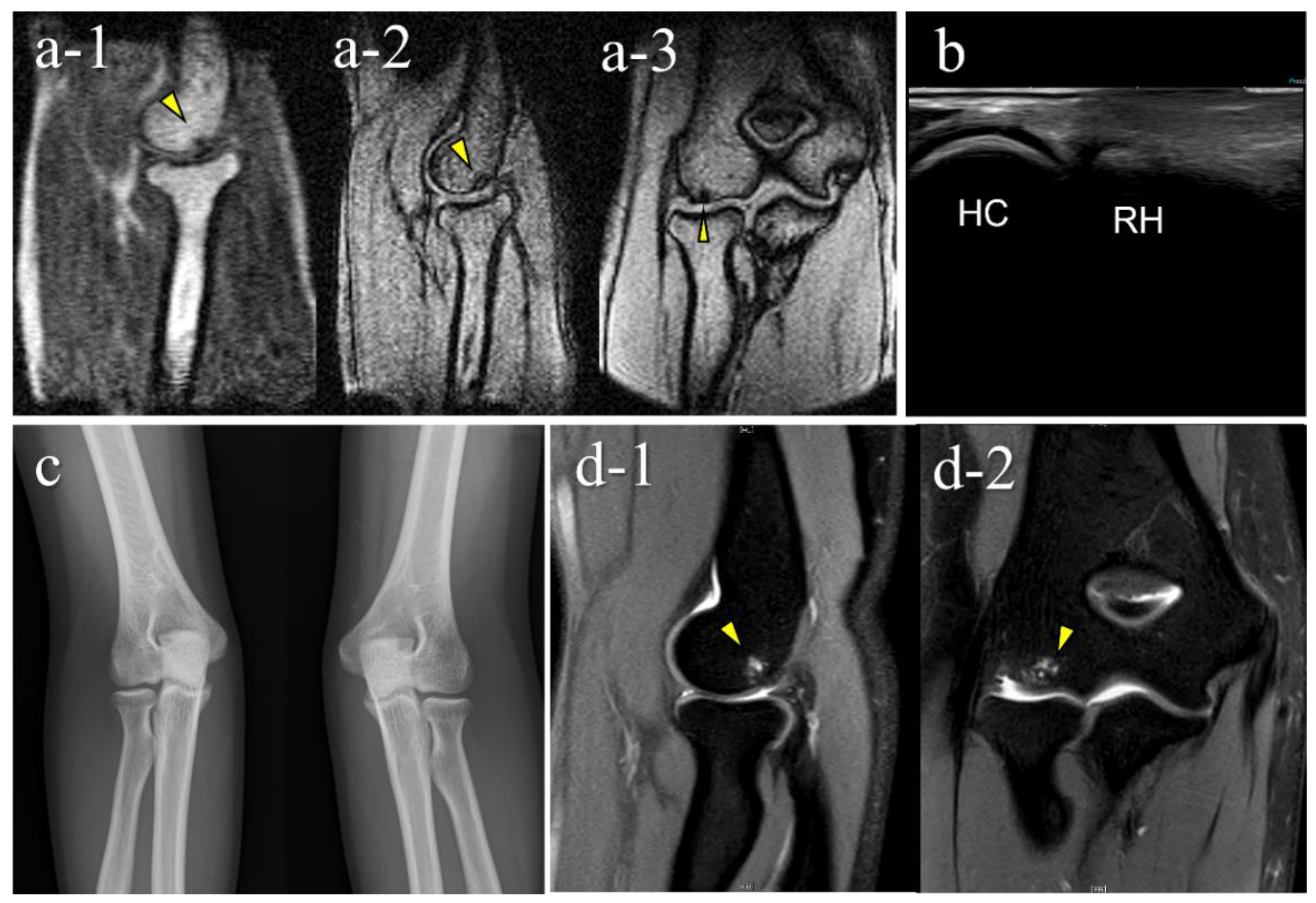 - Takahara, M.; Ogino, T.; Tsuchida, H.; Takagi, M.; Kashiwa, H.; Nambu, T. Sonographic assessment of osteochondritis Dissecans of the humeral capitellum. Am. J. Roentgenol. 2000, 174, 411–415. [Google Scholar] [CrossRef] [PubMed]