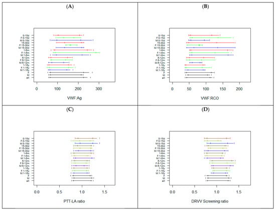 Reference intervals for VWF: Ag (A), VWF: RCO (B), PTT-LA ratio (C), DRVV Screening ratio (D), and APCR ratio (E) in the subjects subgrouped by sex and age. The horizontal segments represent the RIs, while the vertical segments indicate the limits of the 90% confidence interval of the RIs. For each class, RIs are reported combining males and females (red) or, respectively, only in females (green) or males (blue). The last three RIs were calculated without taking into account age, in females, males, or in the whole sample. d = days, m = months, y = years, F = females, M = males.