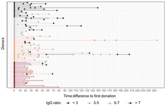 CP donations took place 52 days (median value, range 33–93 days) after convalescence of a RT-qPCR and SARS-CoV-2 anti-N antibody screening confirmed SARS-CoV-2 infection. SARS-CoV-2 anti-S IgG kinetics was monitored for each plasma donation of each individual donor. It is important to note that for the time span investigated, no vaccination was available and thus only infection-acquired antibody levels were investigated. We observed varying levels of SARS-CoV-2 anti-S IgG antibody ratios for the first plasma donation (Figure 1): 12 donors showed an anti-S IgG ratio < 3, 16 showed IgG ratio values between 3 and 5, 18 donors had anti-S IgG ratio values between 5–7 and 20 CP donors showed an IgG ratio value > 7. As expected, we found declining SARS-CoV-2 anti-S antibody levels over time for the majority of CP donors (n = 42). Eighteen donors showed rather stable anti-S levels for the time span observed, while six donors showed rising and falling anti-S antibody levels (Figure 1).