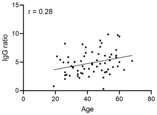 We next asked whether there is a correlation between IgG ratio values and the parameters sex, ABO blood group, age or disease course. A significant correlation between donor age and IgG ratio value of the first plasma donation (Figure 2) could not be found.