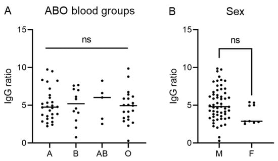 SARS-CoV-2 IgG anti-S ratio levels are independent of ABO blood group (A) and sex (B), male (M), female (F).