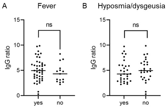 SARS-CoV-2 IgG anti-S ratio levels are independent of a COVID-19 disease course with or without fever (A) and with or without hyposmia and/or dysgeusia (B).