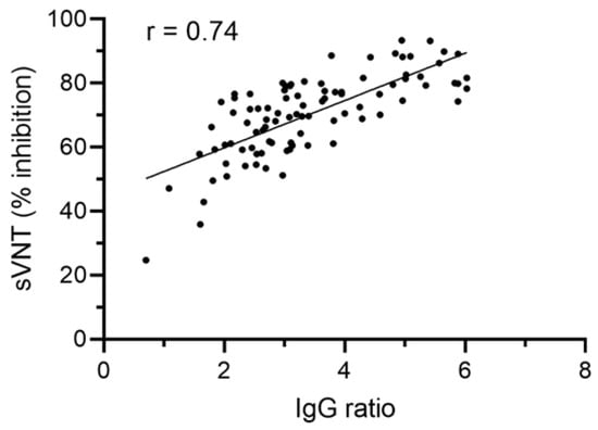 We next asked whether the semi-quantitative IgG ratio value correlates with antibody functionality. Thus, we performed a SARS-CoV-2 surrogate virus neutralization test with a subset of 92 different CP donations of 24 individual donors. Our data show a significant correlation (Spearman’s r = 0.74, p < 0.001) between IgG ratio values and in vitro antibody functionality: CP samples with high IgG ratio values showed higher antibody functionality compared to CP with lower IgG ratio values (Figure 5).