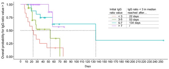 High SARS-CoV-2 anti-S IgG ratio values allow longer CP donation periods. Time-to-event analysis for four different groups of IgG ratio values: <3 (n = 12), 3–5 (n = 16), 5–7 (n = 18) and >7 (n = 20) was conducted. Data shown are overall probabilities for a drop of the IgG ratio value below the value of 3 over time given in days (median values are indicated by dashed lines), log-rank p < 0.0001.