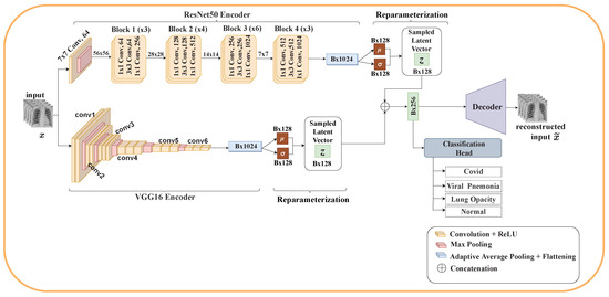 This section details the architecture of our proposed model. Using VAE and ensemble learning, we propose three different architectures for the classification of COVID-19. Each architecture consists of two encoders (ResNet50 and VGG16), reparameterization, a classification head, and either one or two decoders. The classification layers of ResNet50 and VGG16 were removed.