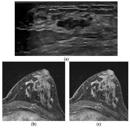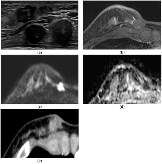 - Bitencourt, A.G.; Graziano, L.; Osório, C.A.; Guatelli, C.S.; Souza, J.A.; Mendonça, M.H.; Marques, E.F. MRI Features of Mucinous Cancer of the Breast: Correlation With Pathologic Findings and Other Imaging Methods. AJR Am. J. Roentgenol. 2016, 206, 238–246. [Google Scholar] [CrossRef]