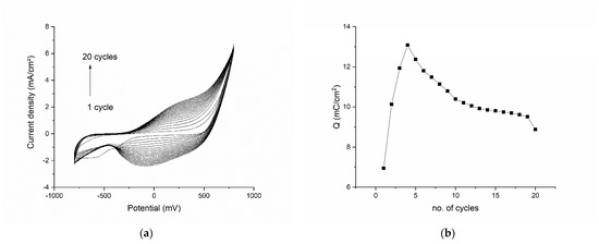 The results of the electropolymerization cycles are presented in Figure 1. The voltammogram shows each of the 20 cycles from the polymerization procedure (Figure 1a). We can see that the first cycle has a broad reduction peak at −550 mV, corresponding to the reduction of an element in the 1M HNO3 electrolyte solution or on the surface of the modified electrode (an impurity). In the subsequent cycles, this reduction peak disappears and is replaced by another broad reduction plateau in the range −100 to −200 mV. The oxidation peak is also broad and begins to be well defined after cycle 4. The shape of the reduction and oxidation peaks can be explained by the poor conductivity of the pyrrole in the beginning of the polymerization, conductivity which enhances as the number of cycles increases. By plotting the total charge exchanged in the polymerization process vs. the number of cycles (Figure 1b) we can clearly see that the charge increases drastically for the first four cycles, only to begin to drop in all the subsequent cycles. This confirms the deposition of a polymeric film onto the working electrode. Another important observation is that the charge decreases slowly after cycle 4, which suggests that the polymeric film is conductive (due, in part, to the graphene as well as to polypyrrole) and the diffusion process is slightly impaired by the composite film.