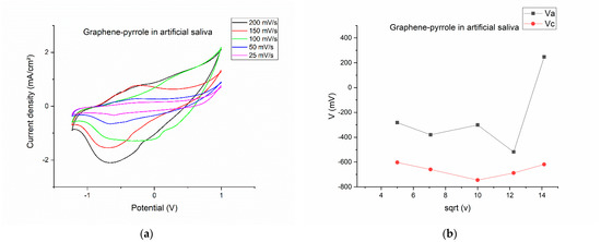 After polymerization, the modified electrode was washed, dried and tested to the artificial saliva solution. Figure 2 shows the results of this test. The CVs were recorded at different scanning rates (Figure 2a) indicating that at high scanning rates the signal becomes distorted (at 100 mV/s, the potential of the reduction and oxidation peaks are shifted completely differently than all the other scanning rates). This becomes interesting because for 150 mV/s, the potential for both oxidation and reduction is proportional with the ones seen at lower speeds. At 200 mV/s, the oxidation peak is completely diminished, but the reduction peak is the most prominent. At lower speeds, we can see that the oxidation and reduction peaks produce a reversible response on the CV.