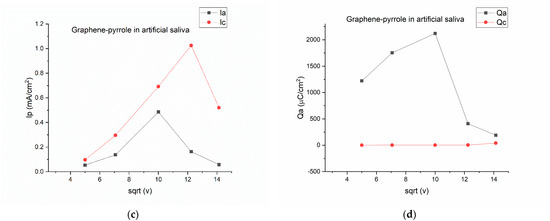 By plotting the parameters of the voltamogram vs. the square root of the scanning speed, we can see the complexity of the reactions on the surface of the electrode. On Figure 2b, the potential is represented vs. the square root of the scanning rate and is obvious that for the 200 mV/s speed the potential for the oxidation is drastically shifted to a positive value, considering that all the other potentials have a negative value. The most stable is the reduction peak, which has a close-to-monotone variation. The same thing is observed in Figure 2d, where the charge for the cathodic peak is monotone, whereas the charge exchanged during oxidation has a non-linear response. This means that the artificial saliva actively interacts with the composite on the electrode, but a pinpoint of the reaction elements is difficult due to the multitude of chemical species present in the solution. Figure 2c gave us hope that the reduction peak should be the one to be pursued if a quantification of the cortisol is to be made.
