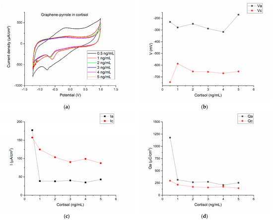 Electrochemical results for the detection of cortisol in artificial saliva with the composite material: (a) the cyclic voltammograms for the six concentrations of hydrocortisone in artificial saliva; (b) the variation of the anodic/cathodic potential with the concentration of the cortisol samples; (c) anodic/cathodic peak intensity variation as function of the cortisol concentration; (d) the charge transfer for the anodic/cathodic processes as function of the different cortisol concentrations.