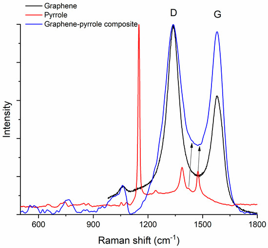 Figure 4 shows the Raman spectra of pyrrole, graphene and the composite. The graphene spectrum presents the two characteristic bands D (1338 cm−1) and G (1579 cm−1) [53], while the pyrrole spectrum shows the C–H in plane deformation of oxidized polypyrrole at 1151 cm−1, the inter-ring stretching of the C–C bond at 1386 cm−1, the C–C and C–N stretching at 1476 cm−1 and antisymmetrical in-plane bending of the C–H bond at 1241 cm−1 [54]. In the composite material, the D-band is conserved and observed at 1338 cm−1 but the peak is “broader” which signifies that the dimensions of the graphene particle have increased. The G-band increases also due to polymerization of the pyrrole and bonding of the pyrrole to the graphene sheet. The peaks for the graphene are better represented in the composite, while the peaks for the polymer appear as shoulders (this is observed at the base of the major peak of the composite, where we can almost “see” the peaks at 1386 and 1476 cm−1 associated with pyrrole). The position of the G-band in the spectrum of the composite remains the same as in the graphene spectrum but the ratio ID/IG is modified: from 1.86 in graphene it drops to 1.06 in the composite material. This decrease of the ID/IG ratio indicates an increase of the disorder (according to Ferrari [55], the D-band appears at 1332 cm−1 in highly ordered carbons, e.g., diamond, and is produced by sp3 atoms; but for all other carbon materials, the D-band corresponds to the breathing modes of sp2 atoms in rings). We assume this happens because the pyrrole is attached to the margin of the graphene rather than on top of the sheet [56,57].