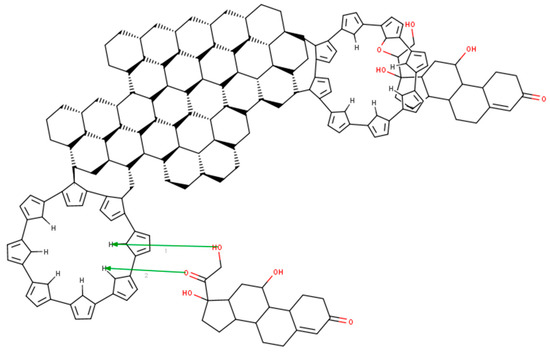 In order to better explain the way the composite and hydrocortisone interact, we developed a model for the composite–cortisol reaction. Even if the model in Figure 5 is 2D, we can easily see that the polypyrrole will attach itself onto the edge of the graphene plate and will form “a plate”. Hydrocortisone will snuggle inside the plate by bonding to the nitrogen atom in the center of the polymer via carboxyl/hydroxyl groups. During this reaction, water will be released in the electrolyte. However, hydrocortisone can bond to the polypyrrole molecule on the out-side plane too. In fact, polypyrrole acts as antennae for the hydrocortisone. Another aspect is that the polypyrrole forms “crowns”, which increase the porosity of the composite (this is sustained by the electrochemistry, because there too we found that the composite was porous and allowed free flow to and from the surface of the electrode).