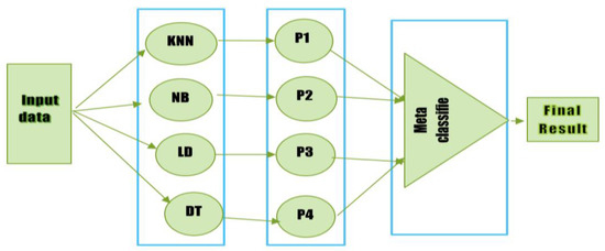 An ensemble learning method called stacking enables a meta-classifier to mix several classification models. A meta-classifier is used to classify the output received from different classifiers (sometimes referred to as level one or base classifiers). Any classifier may be used as a meta-classifier to improve performance. The training of four different classifiers is shown in Figure 1. The outputs of the base classifiers are merged and used to train the meta-classifier, which generates the final prediction. This stack uses four classifiers, each of which was trained separately. After that, they stack their predictions to train the meta-classifier. Three rules serve as the foundation for the stacking classifier.
