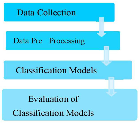 In this research, two datasets were used, one for cardiovascular disease and one for diabetes disease. The diabetes dataset was retrieved from the (https://www.kaggle.com/johndasilva/diabetes accessed on 9 May 1990) website. The data was taken from the hospital Frankfurt, Germany. The data in the diabetes dataset were records from 2000 females in experimental research. Table 1 displays the dataset characteristics where “1” is seen as positive and “0” as negative. Furthermore, “1” stands for a diabetic patient, whereas “0” is a patient with no diabetes. In the diabetes dataset, there are nine characteristics, including Pregnancies, Glucose, Blood Pressure, Skin Thickness, Insulin, BMI, Diabetes Pedigree Function, Age, and Outcome. The cardiovascular disease data set is collated from the given link: https://www.kaggle.com/datasets/christofel04/cardiovascular-study-dataset-predict-heart-disea accessed on 3 October 2020. This dataset has 4000 instances overall and 15 characteristics. Table 2 below provides more information on the various properties and classes. Giving the typical process of prediction systems, Figure 2 describes the categorization workflow for the various research processes.