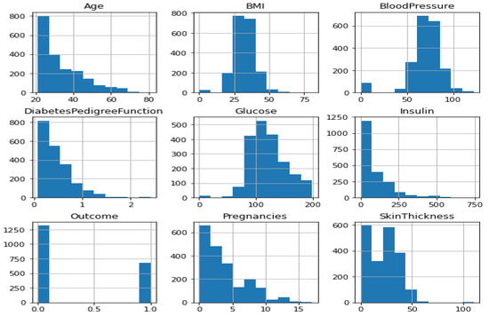 The dataset was converted into a machine-readable format after being downloaded in raw form. Any algorithm’s accuracy depends on the type and quantity of data it has access to. The original data was cleaned up since it was unreliable and noisy before being fed into the classifier for prediction. Because of this, pre-processing methods are essential for raising data quality, which also raises classification precision. The diabetes dataset has several missing variables that cause uncertainty and provide incorrect conclusions. The recommended research data cleaning process is crucial because of the uncertainty. During the data cleaning process, missing values are handled, noise is reduced, and dataset inconsistencies are fixed. Table 3 displays the diabetes dataset. The diabetes dataset consists of 2000 rows and 9 columns. The “outcome” and goal characteristic, represented by the final column, show whether or not the patient has diabetes. Additionally, there are only two numbers in the result column: 1 for diabetes and 0 for non-diabetic. The Panda “Matplotlib” developed library is used to display and recognize the feature distribution seen in Figure 3 and Figure 4.