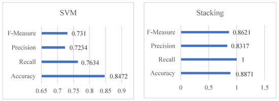 The studies were carried out using an 8 GB RAM, 2.0 GHz Intel Core i5 CPU. Windows 10 served as the operating system. For all datasets, the model was tested and trained using the Keras Python package. In order to explore the suggested stacking classifiers, KNN, NB, LDA, DT, and SVM algorithms are compared in terms of recall, precision, f-measure, and accuracy.