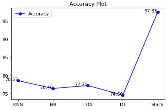 The accuracy differences of KNN, Naive Bayes, LDA, decision tree, and stacking classifiers are shown in Table 5 and Figure 9. Table 5 shows the KNN model obtaining 0.7857 percent accuracy and the Naive Bayes model getting 0.7646 percent accuracy. Figure 8 depicts the accuracy line from KNN to NB utilizing KNN and DT to stack classifiers. LDA performed admirably, with a respectable accuracy of 0.7725 percent. Additionally, Decision Tree has an accuracy score of 0.7460 percent. Finally, the proposed stacking classifier has an accuracy rate of 0.9735 percent. As a result, this study finds that integrated classifiers perform better than separate classifiers. The recommended stacking model, which combines the four classifiers listed above, has a higher accuracy of 0.9735 percent than the other classifiers.
