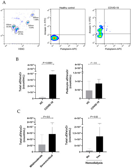 Urinary total and podocyte-derived EVs in COVID-19 hospitalized patients and healthy controls. (A) Flow cytometry gating strategy shows EV identification based on calibration with size beads (100 nm–900 nm) and representative dot plots demonstrate the characterization of total uEVs (Annexin V+) and podocyte-derived uEVs (Annexin V+ Podoplanin+) in a healthy control (HC) and in a patient with COVID-19. (B) Comparison of uEVs between HC and COVID-19 patients. (C) Comparison of total uEVs according to COVID-19 severity and need for hemodialysis. Differences between groups were assessed using Mann–Whitney test.