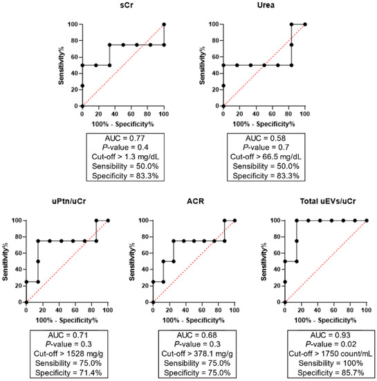 Of note, a sensitivity analysis for the potential influence of age and comorbidities such as diabetes and hypertension on uEV excretion was conducted. We observed no effect of age (p = 0.73), diabetes (p = 0.88), and hypertension (p = 0.56) on total uEV levels (Table S1). Our next step was to assess the potential of uEVs, as well as other laboratory renal function parameters, in predicting clinical outcomes when evaluated early at hospital admission (Figure 2). ROC curves showed that only total uEVs presented a predictive power for hemodialysis, with AUC values of 0.93, sensibility of 100%, specificity of 95.7%, and p = 0.02. On other hand, serum Cr, urea, uPtn/uCr ratio, and ACR did not show significant results.