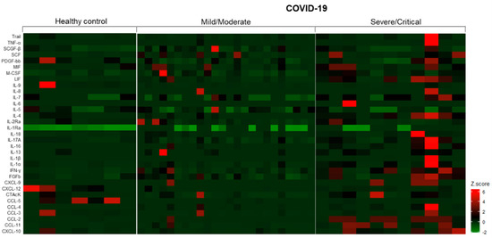 In the present study, we also observed that urinary levels of cytokines, chemokines, and growth factors were increased in COVID-19 patients, especially in those with severe/critical disease. Lamb et al. (2020) previously demonstrated that COVID-19 patients presented elevated levels of proinflammatory mediators such as IL-6, IL-8, and CXCL-10 in urine [41]. Moreover, Laudanski et al. (2021) demonstrated that high urinary IFN-γ at admission was a good predictor of AKI in COVID-19 patients [42]. Likewise, a proteomic-based study demonstrated that changes in urinary cytokines are associated with AKI development [43]. Taken together, significant alterations in urinary immune mediators may be a reflection of the systemic release, often referred as cytokine storm in COVID-19, and these fluctuations appear to be associated with disease severity.